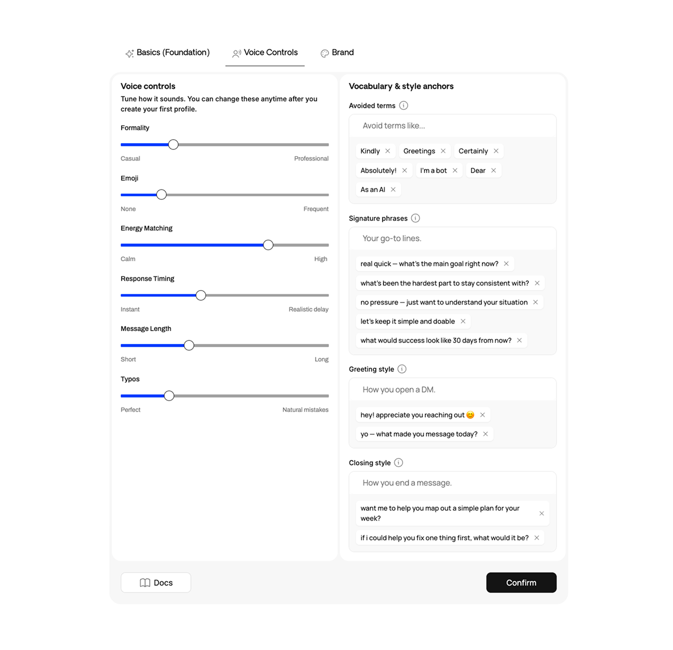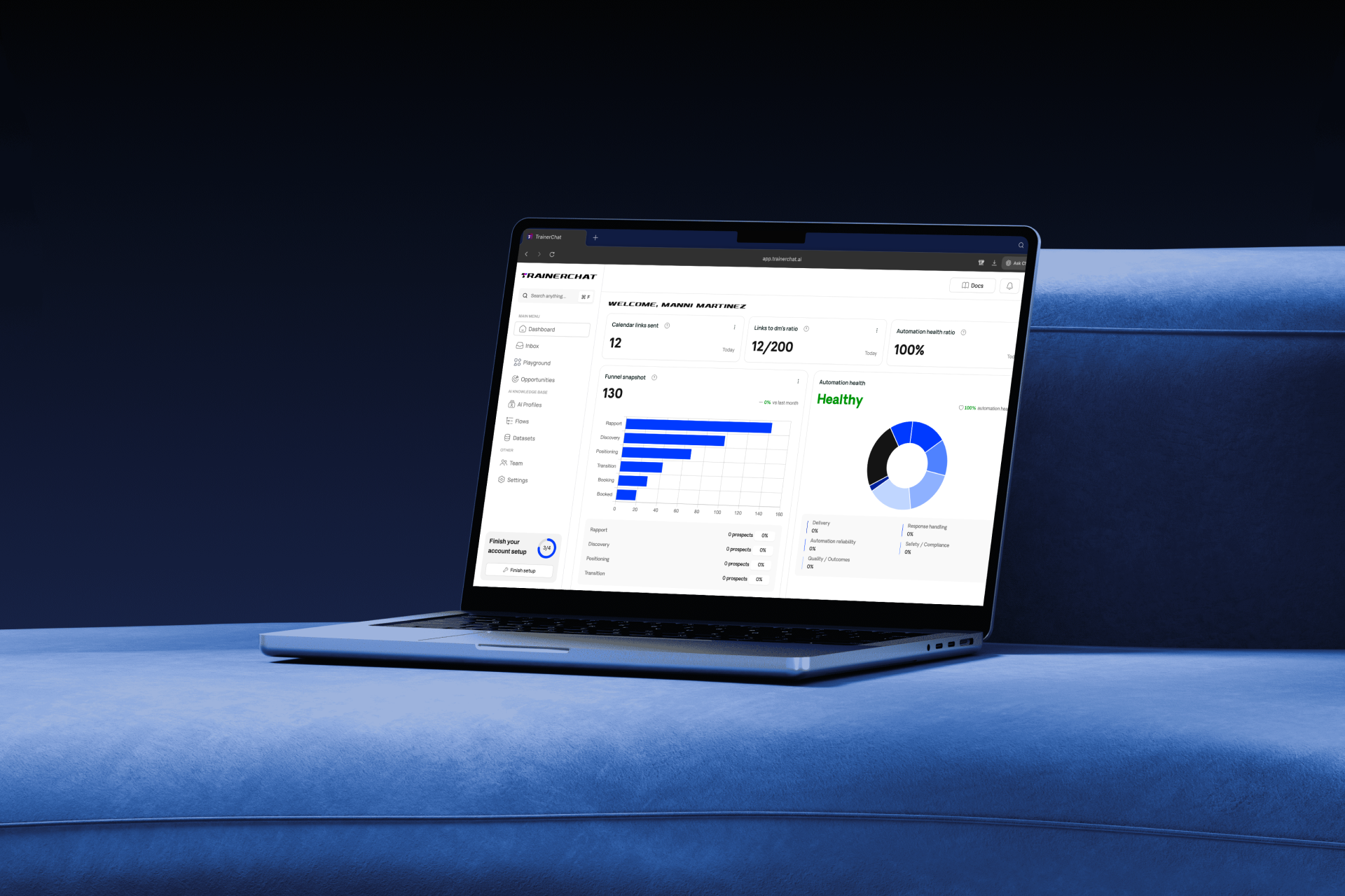 During setup, you have a 5-minute conversation where you explain your coaching approach, personality, and how you typically sell. Your AI also learns from your Knowledge Base - the FAQs, program details, and responses you provide. With the Playbook System, it continuously learns from your successful conversations.